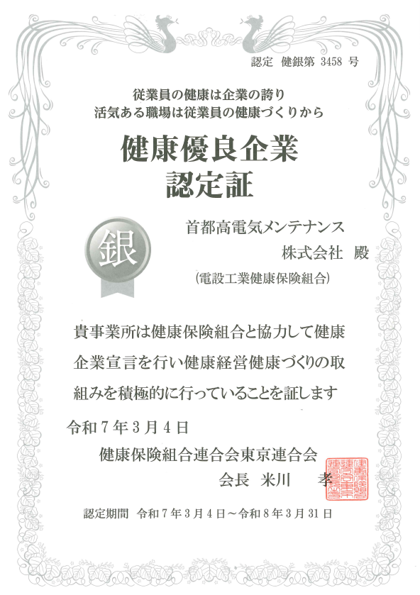 2025年3月4日付で「健康優良企業 銀の認定証」を取得いたしました。