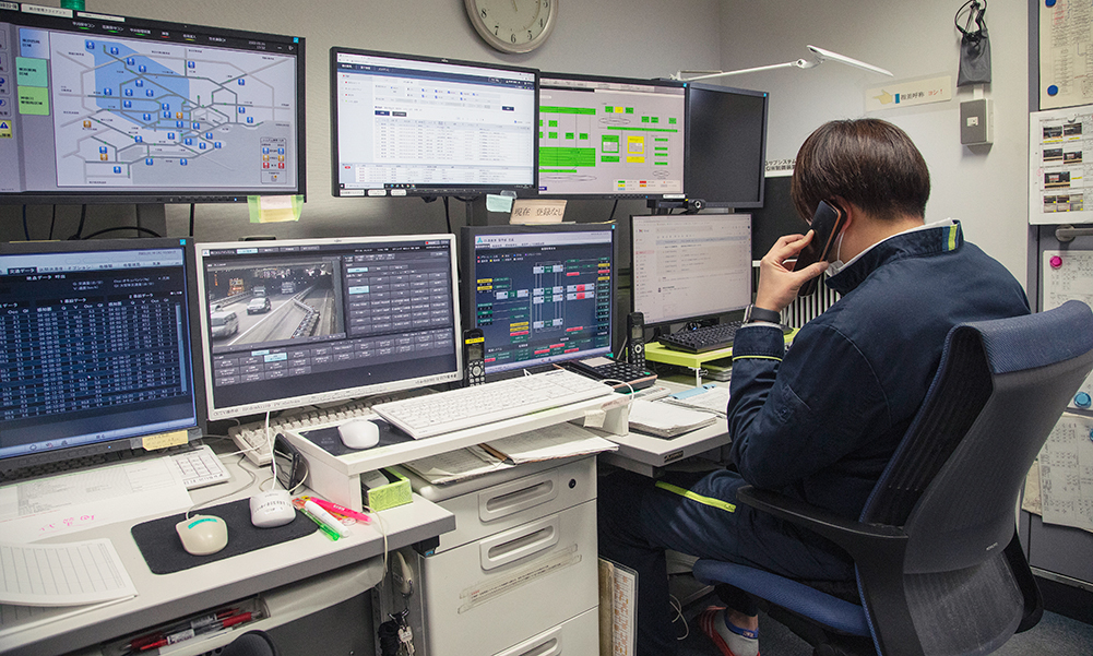 高速道路の安全、快適性、円滑な走行環境確保、渋滞回避などを目的に導入された高度な電気通信技術を駆使したシステムや設備機器。管制スタッフが24時間体制で正常稼働を監視しています。