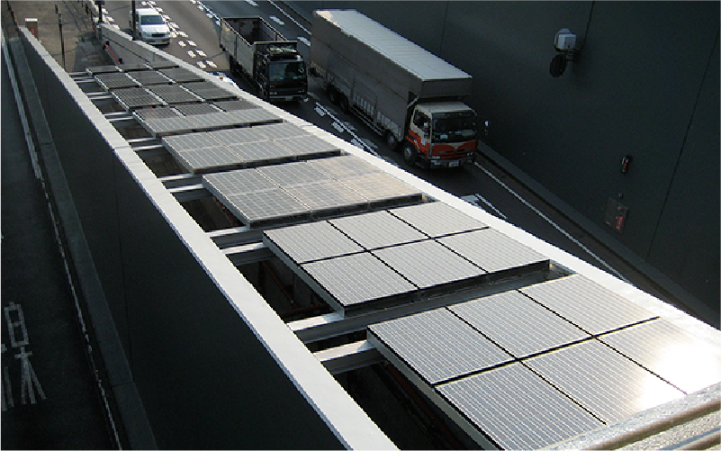 首都高速では、主にパーキングエリア等に自然エネルギーを活用した太陽光パネルを導入し、再生エネルギーの導入にも取り組んでいます。当社は、太陽光パネルの維持管理を行っています。